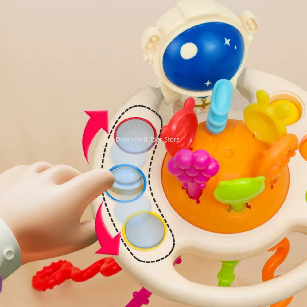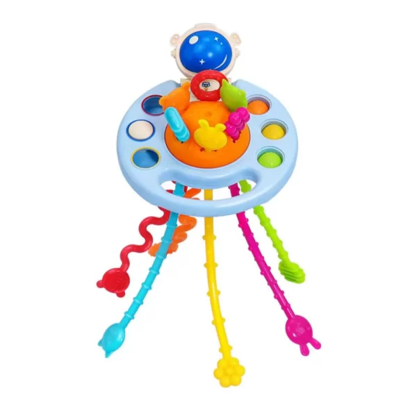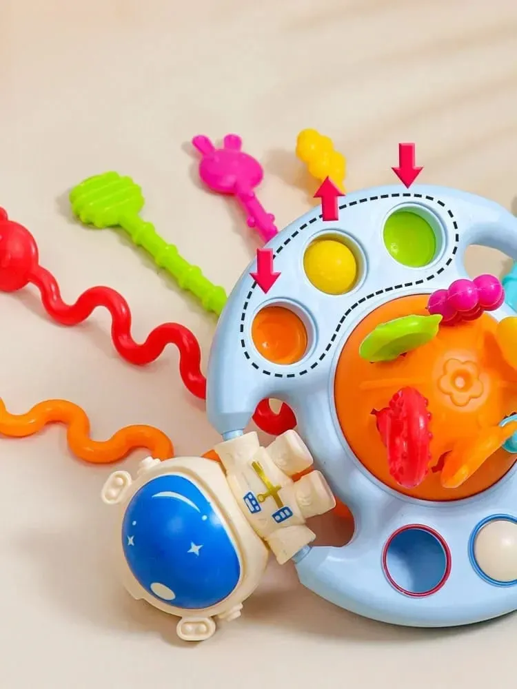 Este divertido juguete sensorial en forma de disco volador está diseñado para estimular los sentidos y la motricidad fina de los bebés. Su diseño ergonómico permite que los más pequeños lo agarren fácilmente, tiren de las cuerdas y exploren los sonidos y vibraciones que producen.